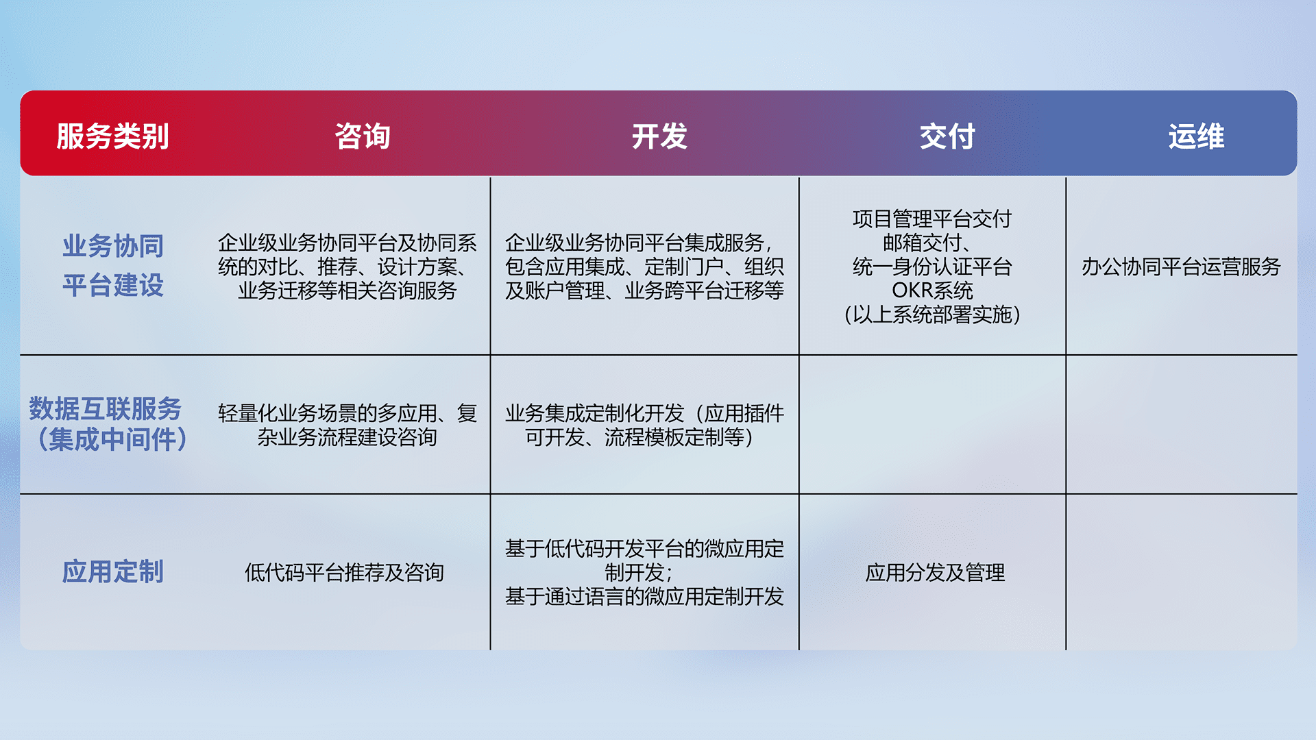 针对钉钉、、企微、、、、IDaas等平台级产品提供产品的规划、、、、方案、、、交付、、、定制化开发等服务,,实现如统一协同办公、、、、智能客户服务、、、、混合会议管理、、、智能数据查询、、、、等业务场景,,实现数字化转型。。。。