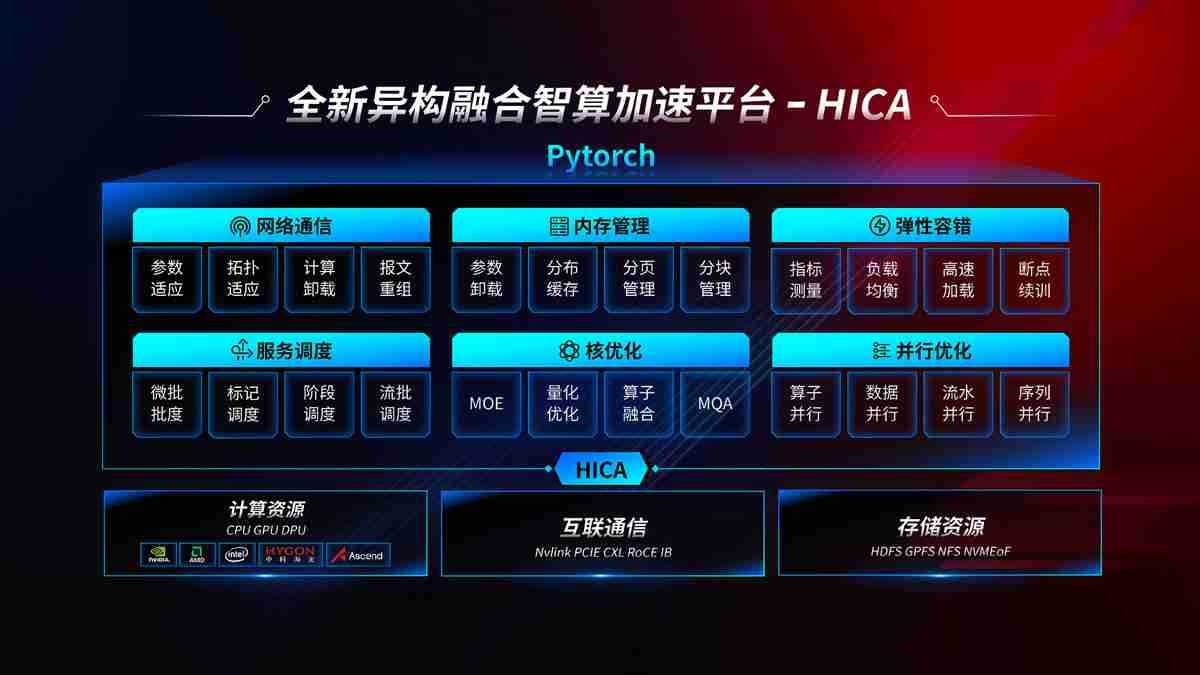 通过自研的服务层、、、中间适配层、、、以及调度编排算法,,,采用数据并行、、、模型并行等多种并行方式,,,把并行计算任务进行有效的分解,,,,使其分别由相应的软件栈和算力资源来承接。。。当GPU资源变化,,HICA可以实时动态调度计算子任务并调整模型拓扑和架构,,以充分聚合各种算力资源。。。