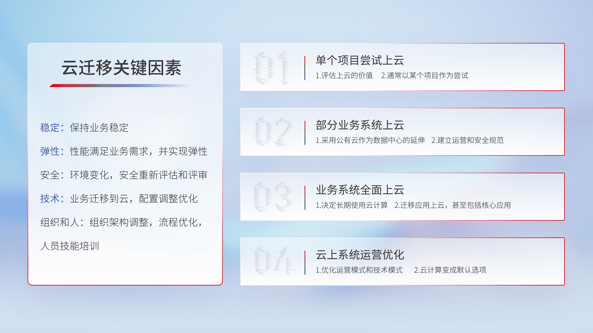 结合实际业务,,,从规划设计、、云平台选型、、、、云原生改造、、、、数据迁移、、、集成交付,,,迁移全过程为客户识别最佳上云路径,,,,做好风险识别管理,,,设计网络架构、、身份权限、、、、安全审计合规、、、操作审计、、、、日志审计、、、监控告警策略、、、多站点容灾设计等,,对云上基础设施进行整体规划,,提升IT治理水平,,,以满足弹性、、、高可用、、、高性能的需求。。。。
