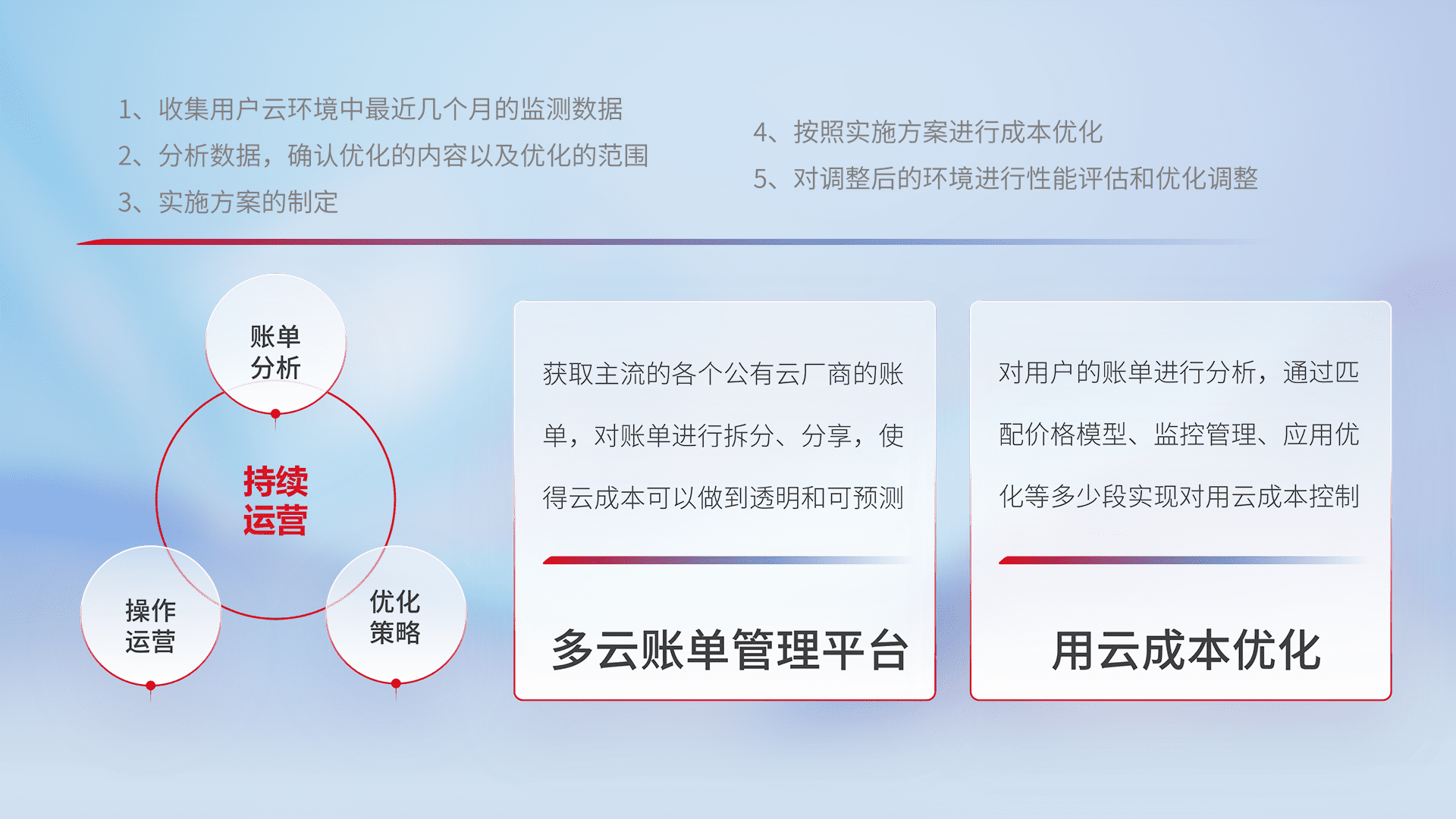 通过多云纳管,,以统一的资源数据模型把客户的云资源进行抽象和封装,,,,进而实现对多云资源的统一操作,,,,保障云资源管理的可靠性、、稳定性与可用性。。。。量身定制化运维内容,,配置、、开发运维、、、补丁管理、、备份、、监控、、、、认证和访问管理、、、审计和日常巡检等,,保障在用云过程中的可靠度,,,,稳定度以及高可用率。。。